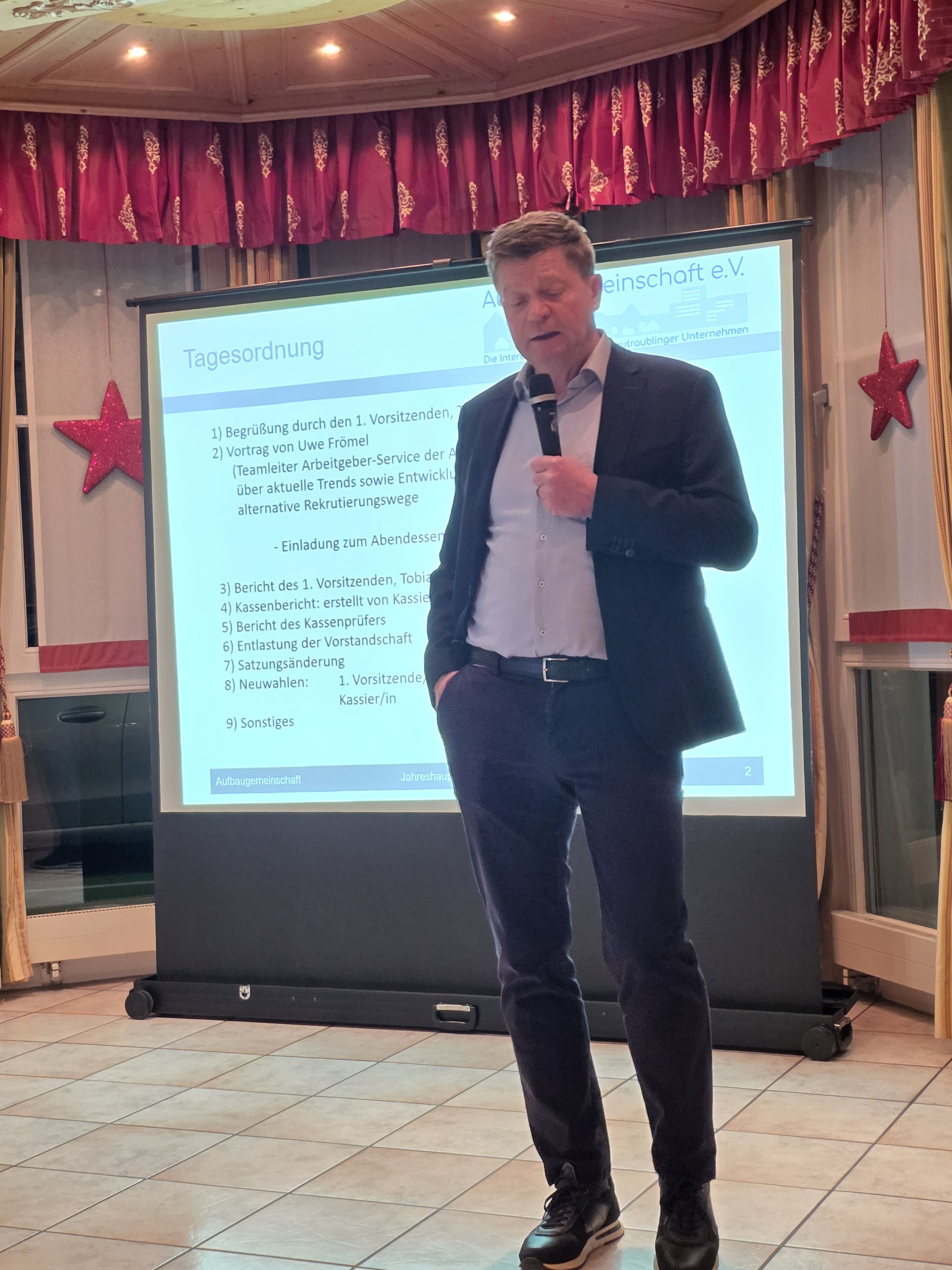Ein Höhepunkt des Abends war der Fachvortrag von Uwe Frömel, Teamleiter Arbeitgeber Service der Agentur für Arbeit. Unter dem Titel „Entwicklung der Personalstruktur am Arbeitsmarkt in Regensburg“ gab Frömel einen fundierten Einblick in aktuelle Trends, Herausforderungen und Perspektiven des regionalen Arbeitsmarktes. Besonders die demografische Entwicklung, der steigende Fachkräftebedarf sowie die zunehmende Bedeutung zielgerichteter Qualifizierung standen im Fokus. Dabei ist auch auf neue Rekrutierungswege eingegangen worden.